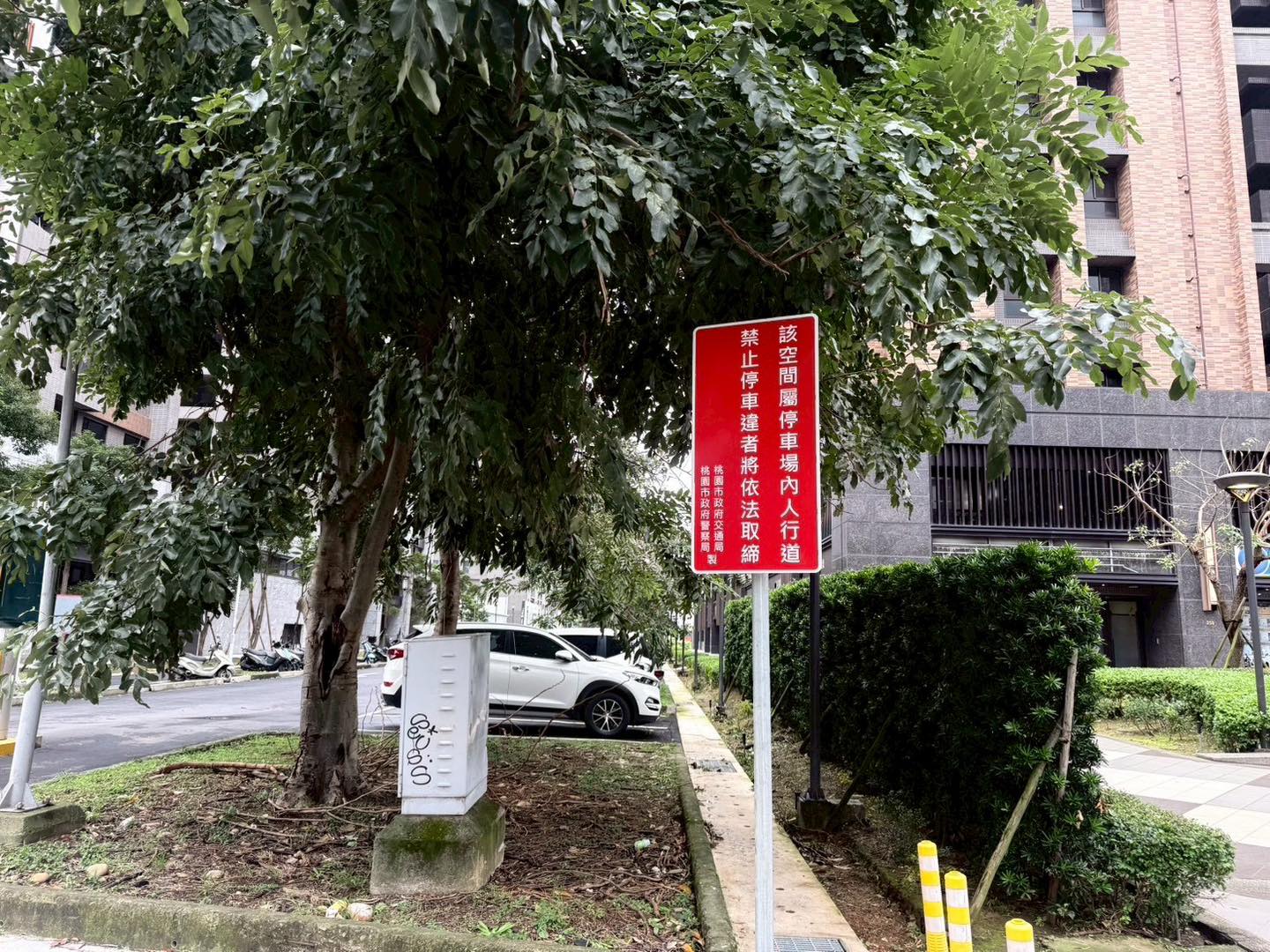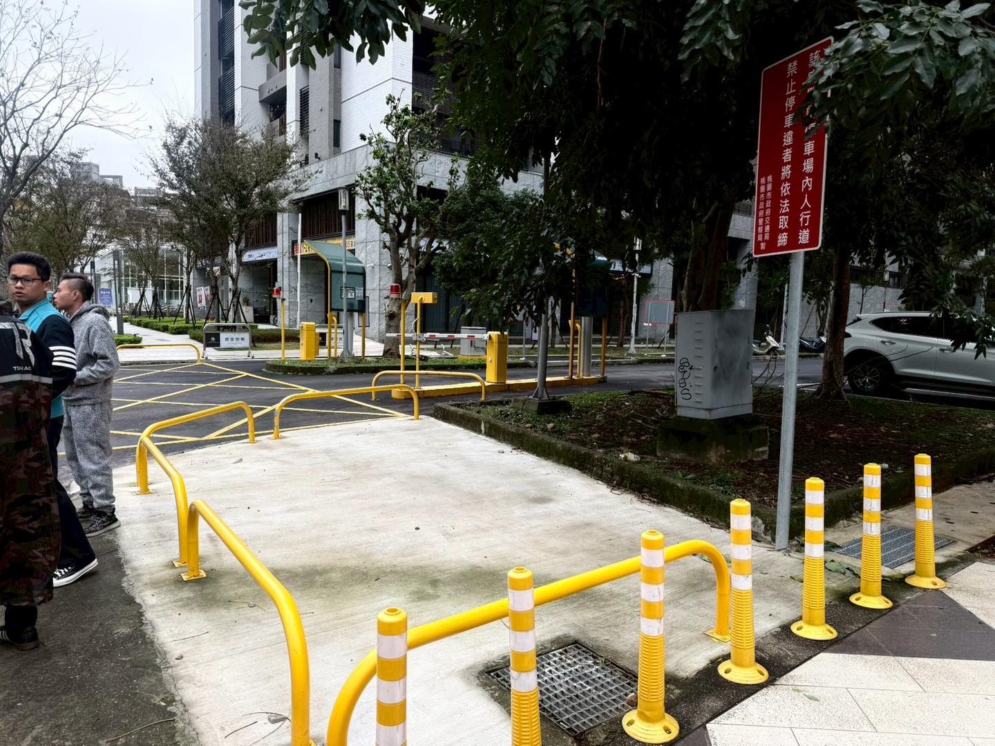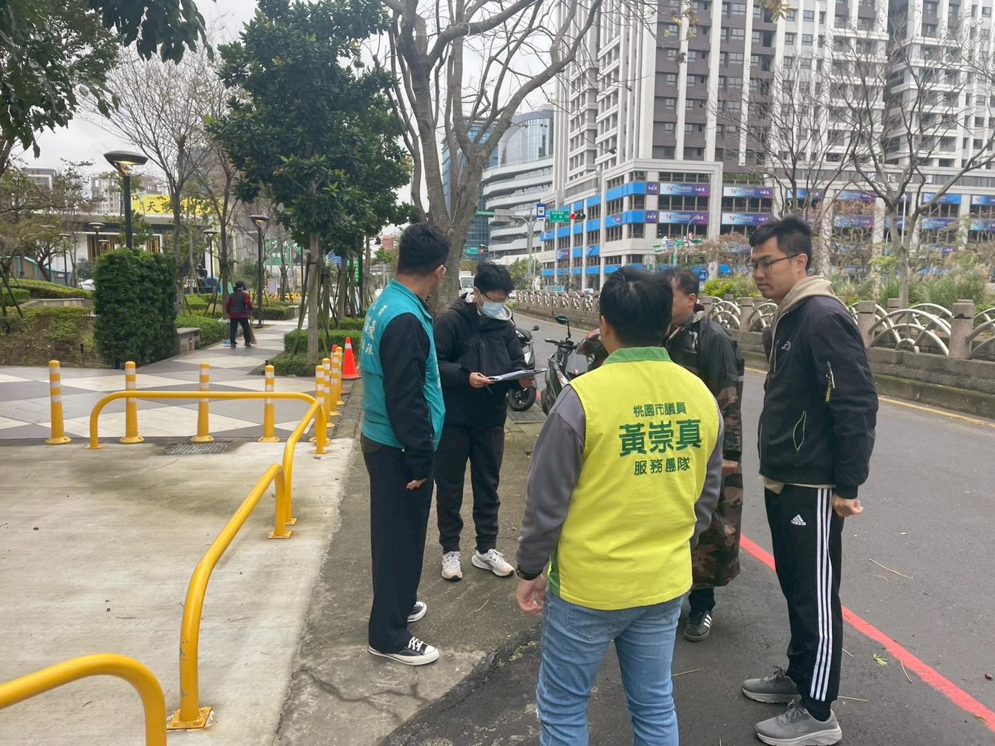 天氣很寒冷,但有熱心民眾反映,青埔多處公共停車場皆有畸零地,過去常發生機車亂停於畸零地造成行人危險的問題,且該處因不屬於法定人行道且無牌面為依據,故無法取締,因此交通局遂將此處空間以ㄇ型鋼圍起來封閉,但民眾仍希望此處空間開放予行人通行,所以辦理此次會勘。