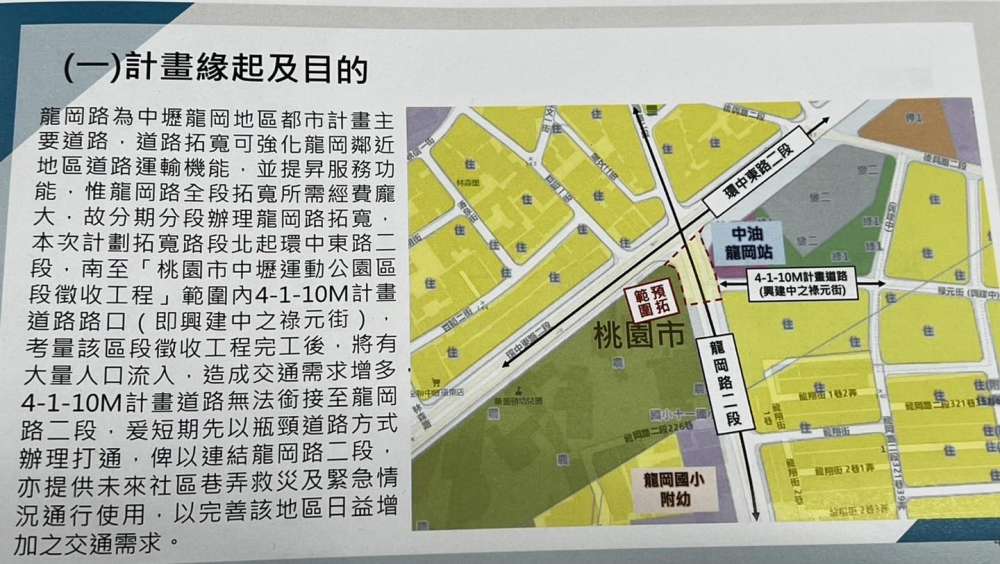 但由於要整條段龍岡路都拓寬經費龐大,所以目前桃園市政府規劃分期分段拓寬,