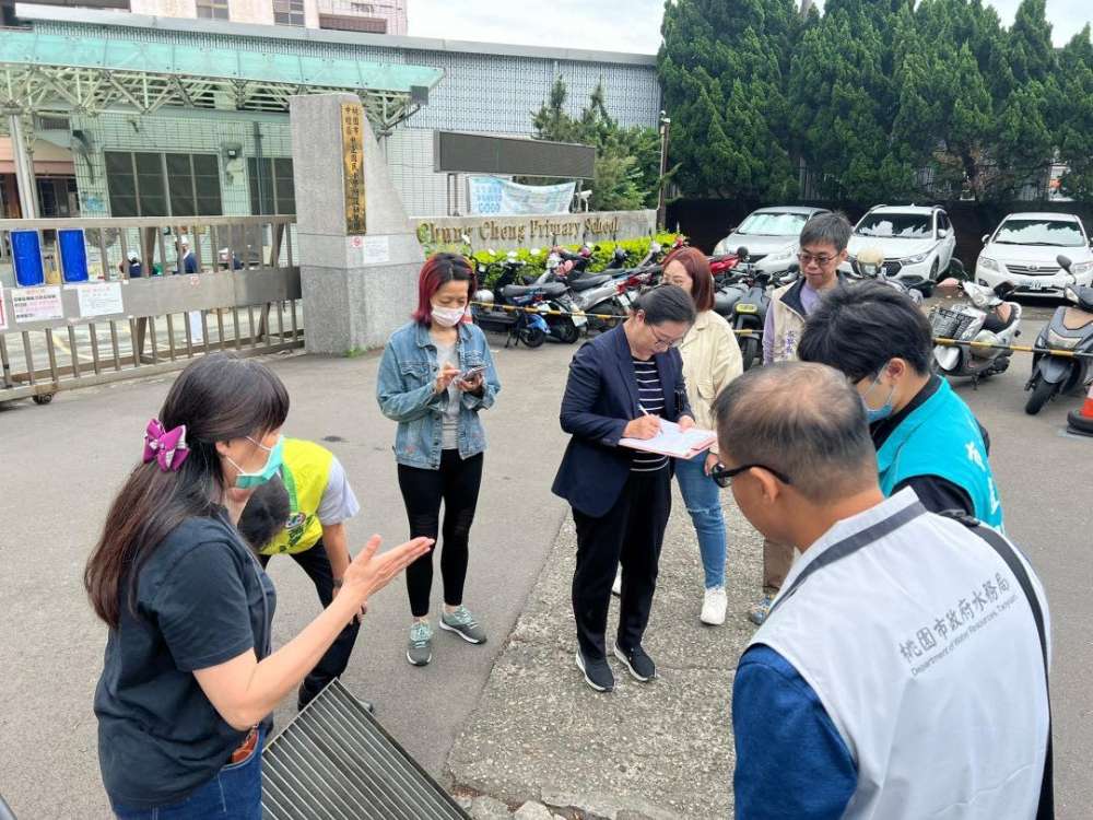 請水利會設置截水閥,避免雨水匯集中正國小大門口,造成淹水。